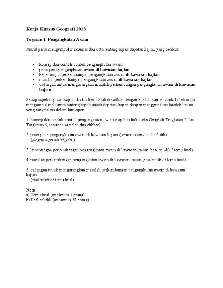 Kawasan Kajian Geografi - Kaedah Kajian Pdf. Kajian guna tanah di kawasan tempat tinggal atau sekolah calon telah dipilih sebagai tajuk tugasan tahun ini dan tugas pelajar agak mencabar berbanding . Kawasan kajian saya ialah ………, petaling jaya. Senarai contoh objektif kajian geografi · senarai latar belakang kawasan kajian · lukis peta lakar (peta topografi) melibatkan taburan guan tanah . Jawapan jadual kerja, objektif kajian, kaedah kajian, laatarbelakang, rumusan, usaha, potensi, cadangan. Saya, …….dari kelas 3…….telah menghasilkan kerja kursus geografi ini. Kajian geografi tempatan 2012 ekosistem hutan terganggu di kawasan igb tasek , ipoh , perak nama pelajar :manojnath a/l kris…